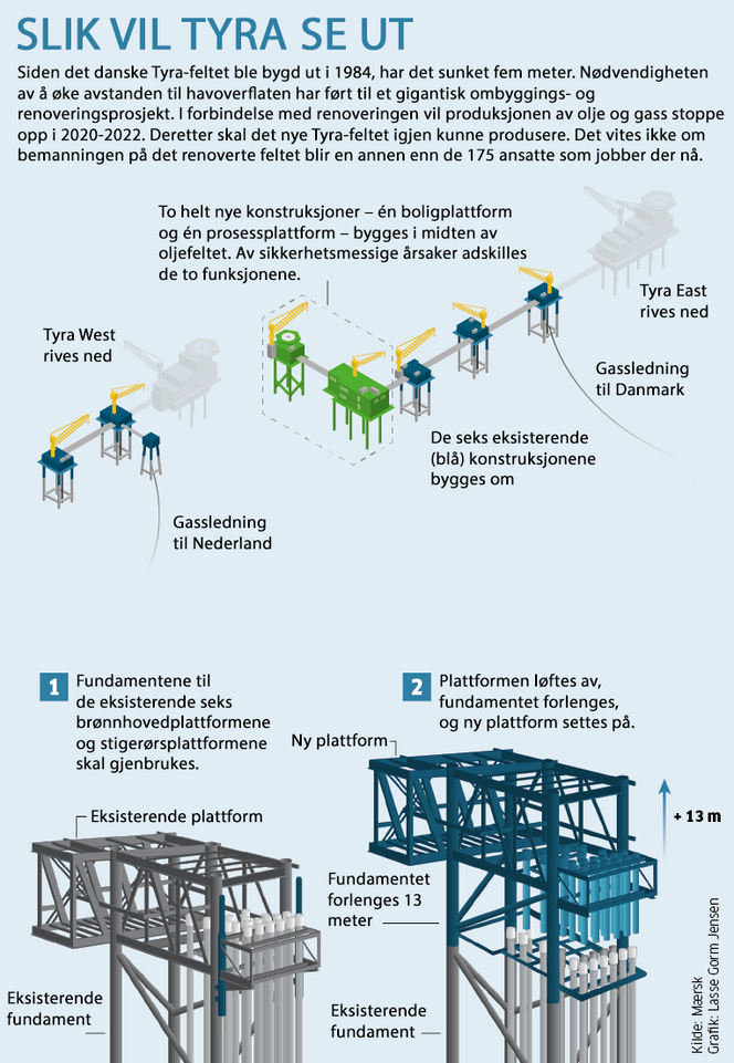 - Det norske Trym-feltets gassproduksjon er knyttet opp mot det danske feltet: Den danske plattformen Tyra synker. Det kan stoppe produksjonen på norsk gassfelt allerede til neste år