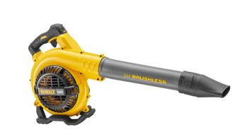 Den gule konkurrenten fra DeWalt er deres toppmodell som benytter et 54 volts batteri. Det betyr ikke at den er tilsvarende mye kraftigere, men den slipper unna med mindre strømstyrke og rimeligere ledningsnett. Den har akkurat like mange watt-timer i batteriet som Makita med sin doble 18 volt, men de bruker wattene mer sparsomt. Forutsatt at den har like god virkningsgrad betyr det litt lavere blåseeffekt, og det har den.