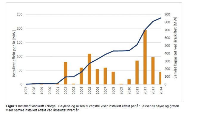 Den samlede installerte effekten av norske vindkraftverk økte dermed fra 811 MW ved utgangen av 2013 til 856 ved utgangen av 2014. De 856 MW vindkraft fordelte seg på 371 vindturbiner.