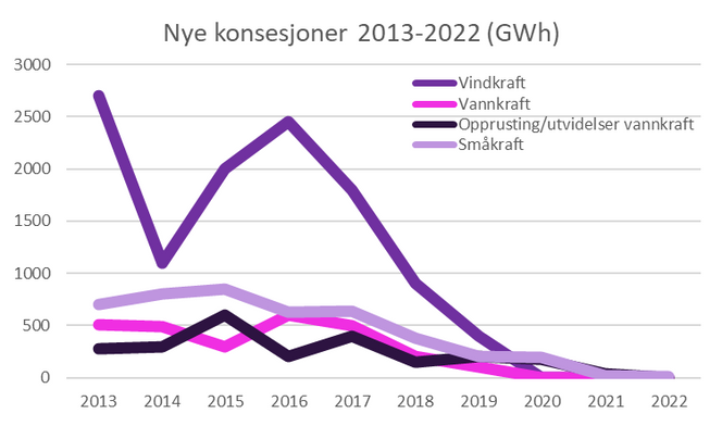 - Ingen nye konsesjoner: Det er foreløpig ingenting som tyder på at investeringstrenden snart vil snu. En av grunnene til dette er at det for tiden blir gitt svært få konsesjoner til bygging av ny fornybar kraftproduksjon. I 2020, 2021 og 2022 har innvilgede konsesjoner, både på vind, vann, oppgraderinger og småkraft ligget omtrent på null.