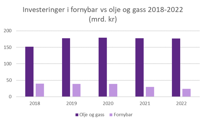 - Lave investeringer: Investeringene i fornybar energi er i dag mye lavere enn i olje og gass. For hver krone som ble investert i fornybar energi her til lands i fjor, ble mer enn sju kroner investert i olje og gass. Investeringene i olje og gass har vært jevnt høye de siste fem årene, samtidig som investeringene i fornybar har gått ned. I 2018 var de totale investeringene i fornybar energi i Norge på rundt 40 milliarder kroner. I fjor hadde dette tallet sunket til 24 milliarder kroner, viser tall fra SSB.