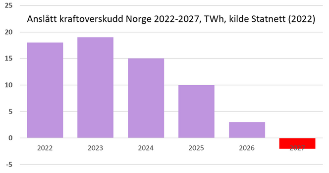 Dette vil ikke bare gjøre at Norge vil slite med å nå klimamålene. Det betyr også at vi risikerer å mislykkes med ambisjonene våre om nye arbeidsplasser; alt fra batterifabrikker i Nordland, på Haugalandet og i Arendal via hydrogenproduksjon i Kvinesdal, Skien og Hemnes til gjødselproduksjon i Porsgrunn og ammoniakkproduksjon i Hemnes og Sauda. Alt dette vil kreve mellom 30 og 40 TWh. Mye av dette er kraft vi i dag ikke har.