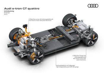 At bilene er nært beslektet med Porsche Taycan understrekes videre av at Audi i likhet med sine kolleger i Stuttgart har utstyrt bilen med en totrinns girkasse på motoren på bakakslingen. Motoren på fremakslingen har som elbiler flest bare ett gir.
