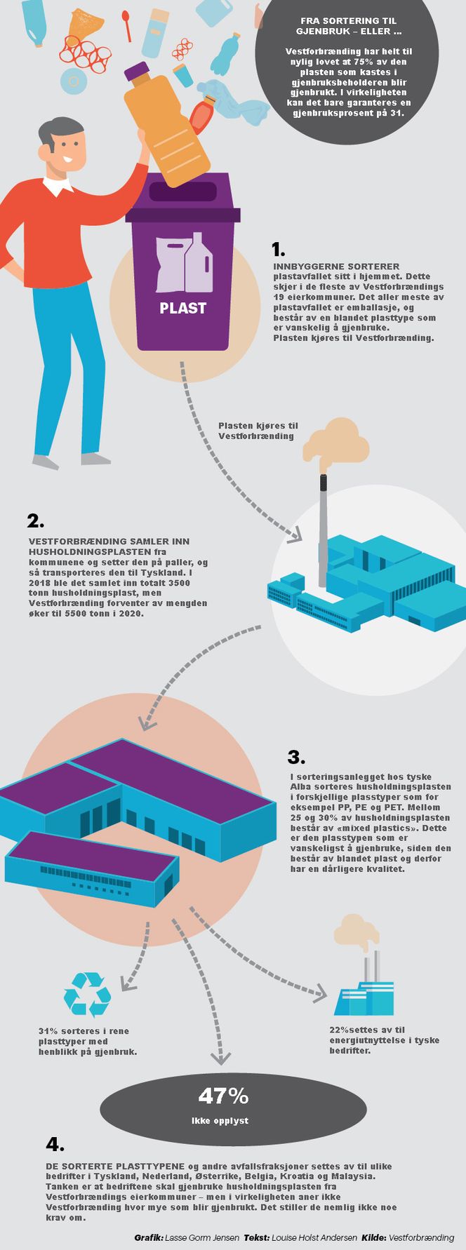 Når Vestforbrænding har samlet inn den sorterte plasten fra husholdningene i hovedstadsområdet, sender de den til et stort sorteringsanlegg i Tyskland. Men så snart dette anlegget sender plasten videre til andre bedrifter, teller den som gjenbrukt – selv om Vestforbrænding ikke vet hvor mye av den som i virkeligheten blir brent.