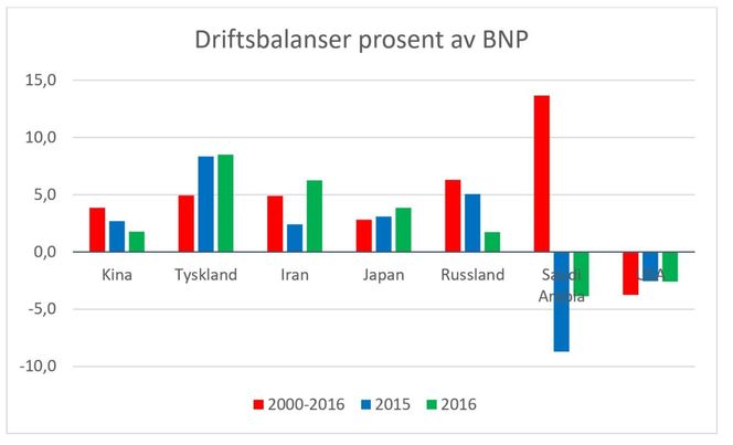 Russland hadde derimot et samlet driftsoverskudd på over 1.000 milliarder dollar i løpet av perioden, uten ett eneste år med underskudd. Iran hadde heller ikke et eneste år med underskudd på driftsbalansen og kan utvise et samlet overskudd på 300 milliarder dollar i løpet av disse årene. Saudi Arabia hadde et samlet driftsoverskudd på godt over 1.000 milliarder dollar, men hadde underskudd i 2015 og 2016. I Saudi-Arabia har staten, fyrstehuset og den private sektor store oppsparte midler, først og fremst i USA.
