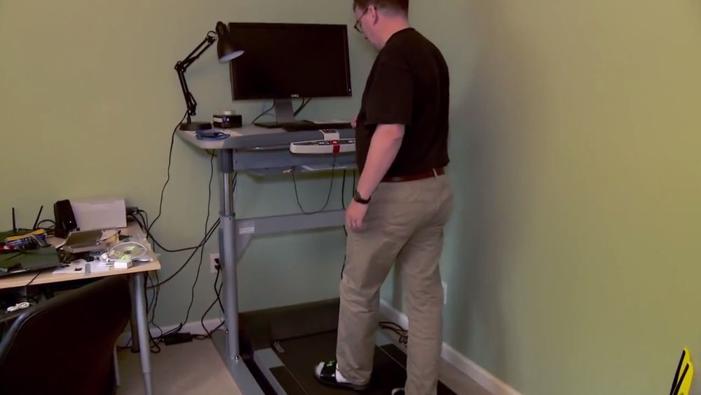 Til høyre for det gamle skrivebordet, ser man et stående skrivebord med en tredemølle under. Dette er hans nye arbeidsområde.