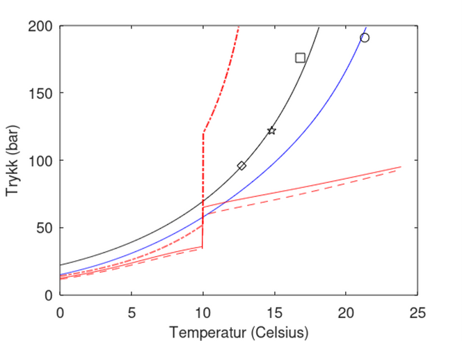 Dernest må hydratet som dannes, være mer stabilt enn hydrat dannet av CH4. Det første kriteriet kan vi evaluere ved å se på hvilke betingelser av trykk og temperaturer som favoriserer de to typene av hydrater: hydrat fra CO2-blanding og hydrat fra CH4.