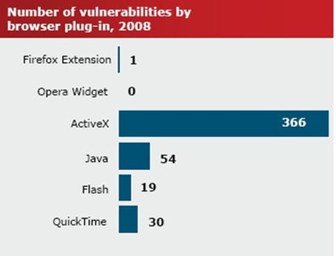 Av disse er det ActiveX-kontrollere som har suverent flest sikkerhetshull, med totalt 366 i 2008. Det er opp fra 339 i 2007 og 45 i 2006.