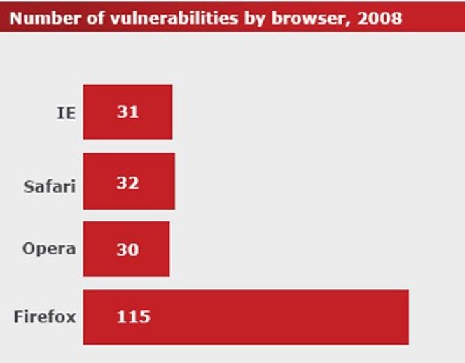 Av de fire hadde Firefox det klart høyeste antallet rapporterte sikkerhetshull, med hele 115 i løpet av 2008.