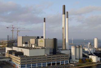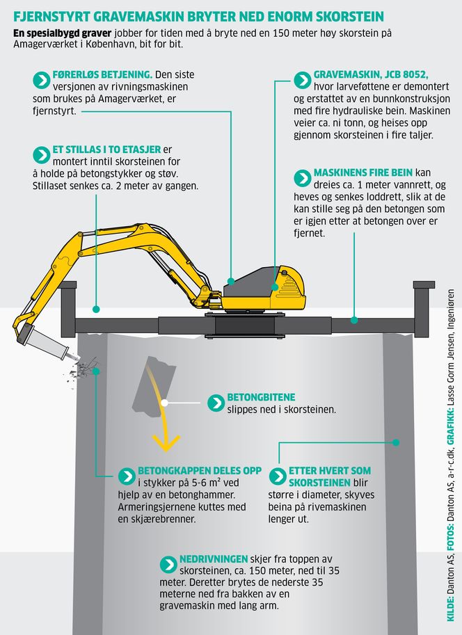 På Amagerværket står det en gravemaskin på toppen av en skorstein 125 meter over bakken. Den fjernstyrte anleggsmaskinen er pakket inn i et 12 tonn tungt stillas, og skal fram til mai måned brukes til å bryte ned betongskorsteinen.