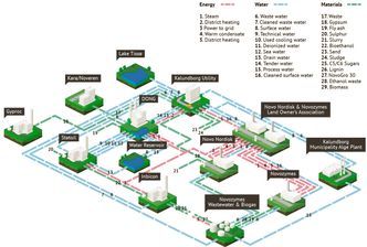 Store grønne rør strekker seg mellom industribedriftene i Kalundborg i Danmark. I rørene går det blant annet damp fra Dong Energy til Novo Nordisks insulinfabrikk, Novozymes enzymfabrikk og Statoils oljeraffineri.