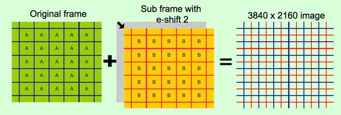 Den støtter heller ikke et 4K-innsignal. Derfor er det vel ikke helt korrekt å kalle projektoren noe som inneholder navnet 4K. Det JVC gjør med sin e-shift2 teknologi er å lage et ekstra bilde hvor hele bildet flyttes en halv piksel ned og en halv piksel mot høyre.