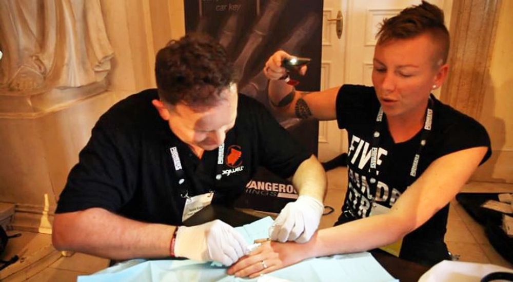 Både den norske Iris Ai-gründeren Anita Schjøll Brede og bioforskeren Elsa Sotiriadis var en av ti som fikk chip injisert på scenen. Det var ikke akkurat smertefritt, men etterpå kunne Sotiriadis sende en tweet på Twitter og spille av musikk ved å koble chipen til Android-telefonen.