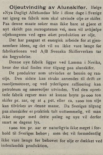 Ved å sitere publikasjonen Nya Dagligt Allehanda, kommer det frem at i det «disse dager i Sverige blir sat igang en fabrik som skal utvinde olje av skifer».