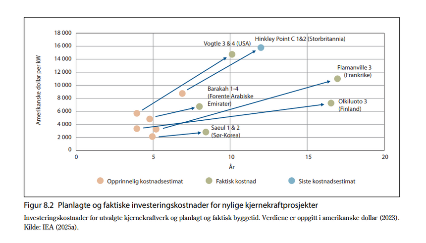 Figur 8.2 i Kjernekraftutvalgets rapport viser et bredt kostnadsspenn fra internasjonal kjernekraftutbygging: Vogtle 3 og 4 i USA kostet 14.700 dollar pr. kilowatt (kW), Olkiluoto 3 i Finland kostet 7200 dollar/kW og Saeul 1 og 2 i Sør-Korea kostet 2700 dollar/kW (tall fra Det internasjonale energibyrået, IEA, 2024).