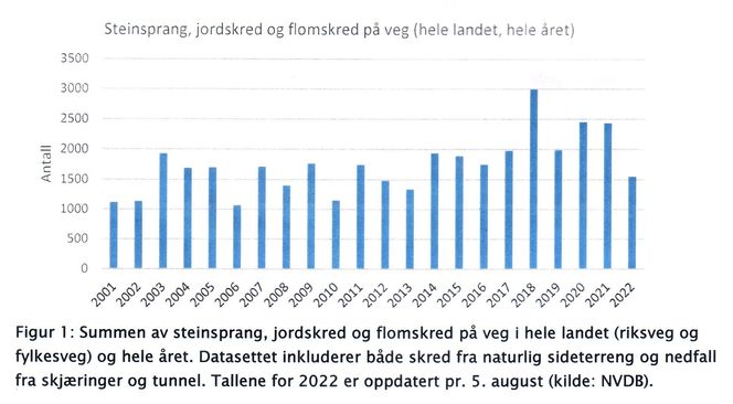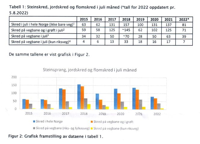 Et ferskt notat fra Statens vegvesen gir en oversikt over skredaktiviteten – steinskred, jordskred og flomskred i juli måned for årene 2015 – 2022. Det overraskende er at tendensen viser minimale endringer i perioden.