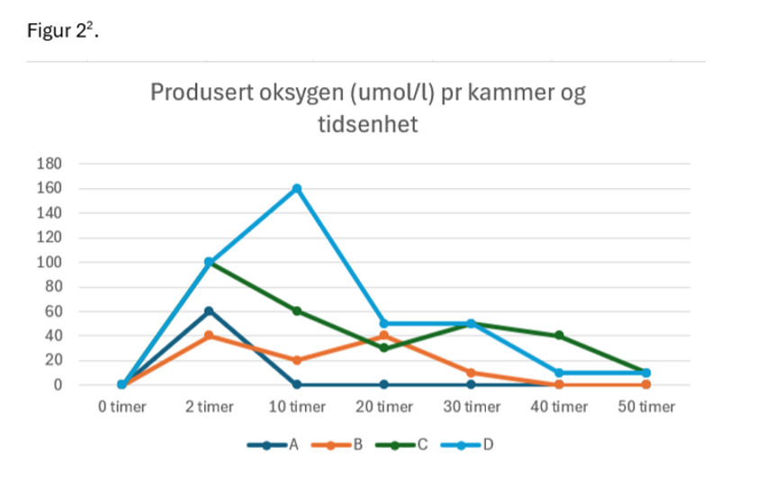 Figurenes form viser akkumulert oksygenproduksjon over to døgn og folk flest tror dette er en produksjon som fortsetter videre etter de to døgnene. Utflatingen av kurvene betyr imidlertid at produksjonen stopper opp. Jeg har derfor skjønnsmessig tatt ut fire av testene