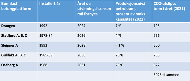 Men den store klimagevinsten dersom disse plattformene slutter med hydrokarbonproduksjon, er nettopp dette. De fem plattformene med lavest produksjon (det vil si unntatt Oseberg A og Gullfaks A, B og C) produserer hver omtrent 11.000 fat oljeekvivalenter i snitt daglig. Omregnet til CO2-utslipp som skjer hos sluttbrukeren, er dette til sammen omtrent 6,4 millioner tonn årlig utslipp som elimineres dersom de fem plattformene bygges om til bruk i havvind.