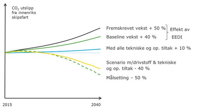 Figuren viser hvordan utslippene kan ventes å vokse om dagens teknologi legges til grunn (fremskrevet vekst), samt de ventede utslippene når vi tar hensyn til vedtatte energieffektiviseringsregler – EEDI (baseline vekst). Videre viser figuren hvordan opptak av tekniske og operasjonelle tiltak kan begrense veksten kraftig, slik at utslippsnivået i 2040 er omtrent på dagens nivå.