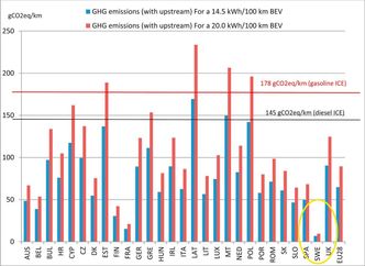 Så i Sverige vil en elbil bare slippe ut 7-9 CO2-ekvivalenter per kilometer, mens i Latvia er utslippene 169-234 CO2-ekvivalenter per kilometer. Gjennomsnittet i Europa er 65-89 CO2-ekvivalenter per kilometer.