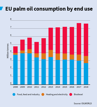I alt brukte EU over 4 millioner tonn rå palmeolje til å lage biodiesel på europeisk jord i 2018. Men samtidig importerte EU i alt 1,2 millioner tonn allerede raffinert biodiesel fra palmeolje.