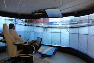 En kaptein fra Svitzer styrer taubåten Hermod i Københavns havnebasseng mens han sitter trygt i en kapteinstol med 360 graders kamerasyn, og 180 grader på store skjermer samt motorlyden over høyttalere.