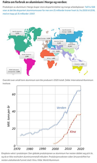 I 2020 ble det produsert over 65 millioner tonn aluminium. Kina står for ca. 60 prosent av produksjonen. Til sammenlikning produserte Norge 2 prosent av den globale produksjonen (1,3 millioner tonn). Faktisk har verdens aluminiumsproduksjon nesten doblet seg på ti år. Det gjør at mer klimavennlig produksjon er en sentral utfordring: