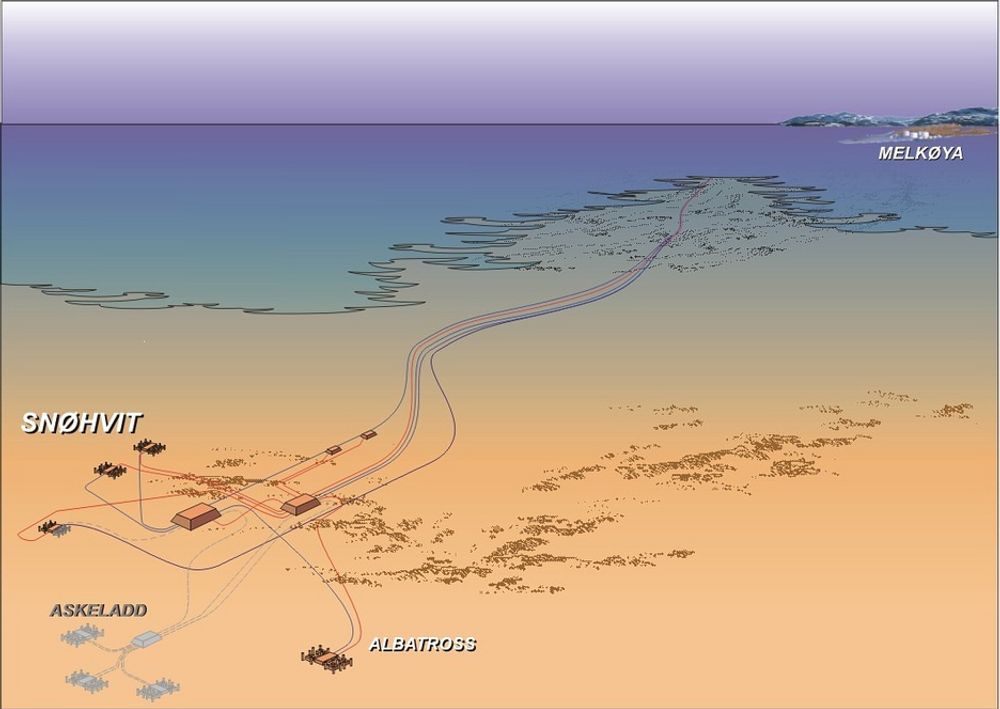 Naturgassen fra feltene Snøhvit, Albatross og Askeladd føres til mottaks- og prosesseringsanlegg på Melkøya utenfor Hammerfest. LNG-anlegget (Liquified Natural Gas) er verdens mest energieffektive.