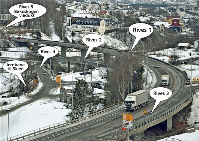10 konstruksjoner skal rives for å gi plass til de nye vegene. Den største er en bru som inngår i E18 i dag. Den er 239 meter lang og krysser Vestfoldbanen, en fylkesvegbru, Farriselva og turbinrør.