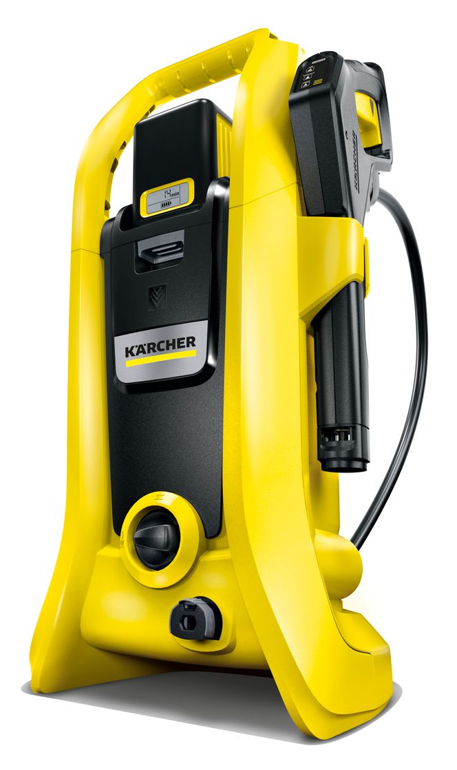 Kärcher har også en annen batteridreven kreasjon i sortimentet. Det de kaller en håndholdt batteridrevet spyler er faktisk en alt-i-ett maskin hvor både motor og batteri sitter i en stor pistol. Med et maks trykk på 24 bar er nok spyler, og ikke høytrykkspyler, en grei betegnelse.