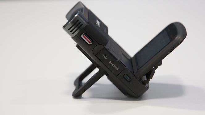 Dette kameraet har USB for direkte overføring av filer, HDMI for direkte bildeoverføring, hodetelefonutgang og mic-inngang. I tillegg er det egne knapper for av/på (med linsedeksel), rec-volum, avspilling og opptak.