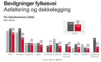 Fra 2016 og fram til 2020 har bevilgning til asfalt på riksveier gått ned fra 1300 millioner kroner til 650 millioner kroner. Fylkene har på sin side en nedgang i bevilgninger til asfalt på 27 prosent i forhold til 2019, skriver Arne Aakre.