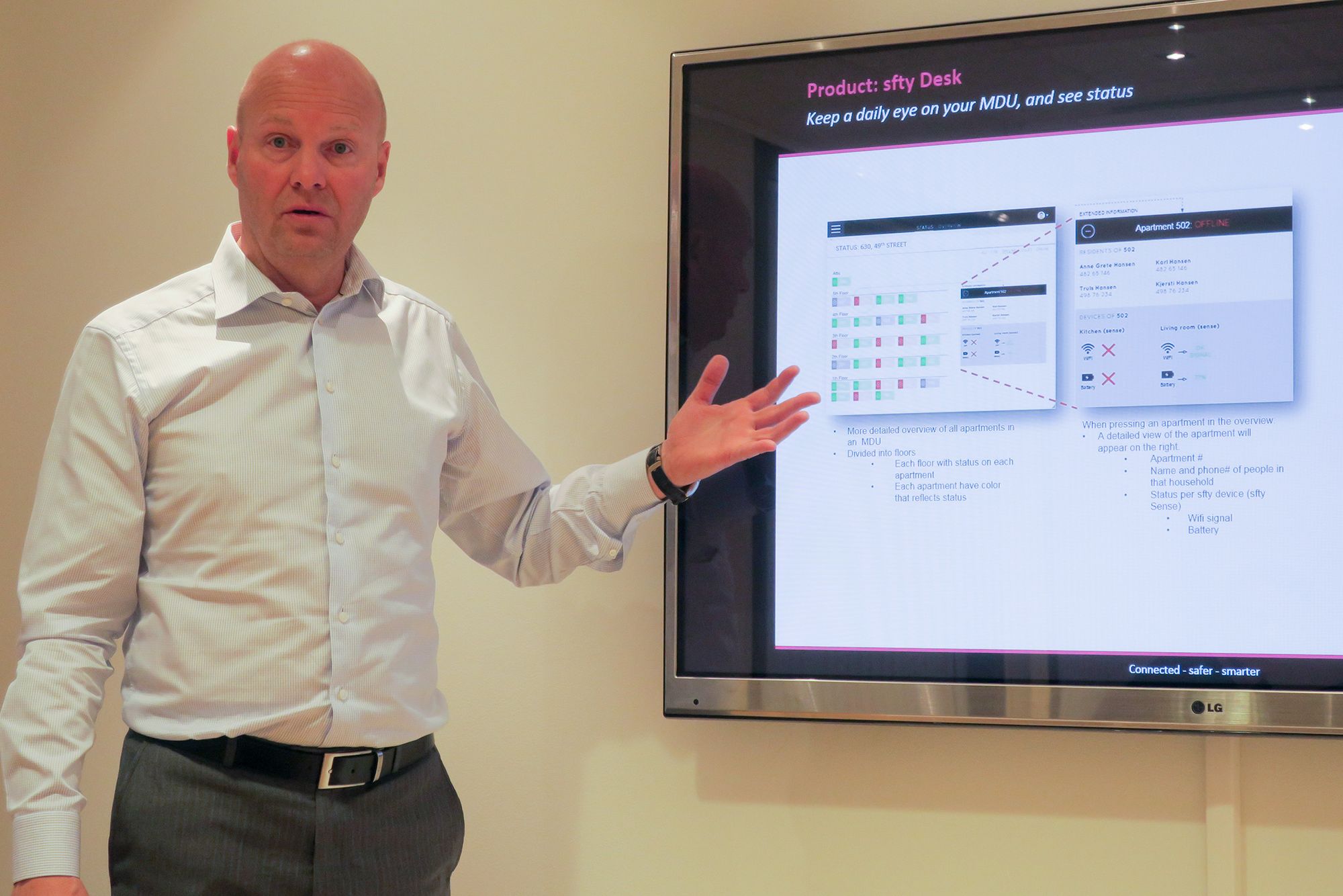 – Kommunikasjonen via et såkalt mesh-nettverk er også veldig godt egnet i bygårder. Det kan være veldig viktig å alarmere de andre beboerne hvor det blir brann i en leilighet. Når alle leilighetene har en slik, kan de snakke sammen via meshradioen. Går det av en alarm og røykutviklingen fortsetter, eller den ikke blir skrudd av, begynner sirenene i alle Sense-enhetene i gården å ule. Hvis den skrus av betyr det ikke at den slutter å virke, men at sensitiviteten en stund senkes til en tredjedel. Går alarmen i trappeoppgangen går den samtidig hos alle beboerne, sier sjef og gründer i sfty, Stein Bakker.