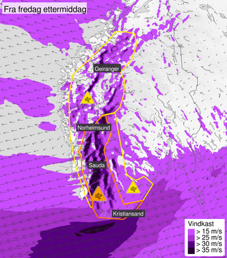 Det er sendt ut oransje farevarsel for vind i deler av Agder, indre strøk av Rogaland og Hordaland. Varselet er gyldig fra fredag klokka 15. For mange andre steder er det sendt ut gult farevarsel for vind.