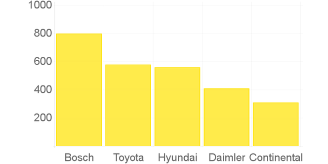 Selvkjørende biler – fremdrift og styring av bilen skjer nå uten hjelp av mennesker. Det brukes sensorer, kontroll- og navigasjonsutstyr som responderer smart på omgivelsene når man ferdes fra A til B. Ser vi på hvem som har registrert flest patenter her, får vi følgende liste: