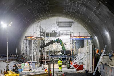 Men under føttene deres, 30 meter ned, er det allerede ferdig sprengt en 200 meter lang stasjonshall. Der nede bygges et nytt kollektivknutepunkt, tett klemt mellom elv, jernbane og med en av landets travleste motorveier like ved siden av.