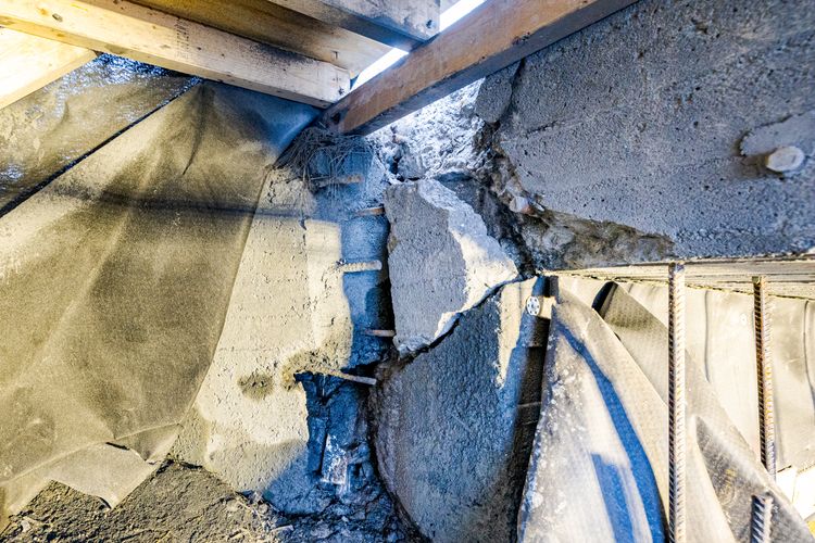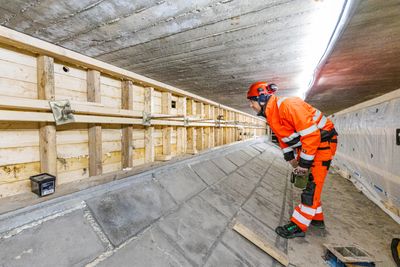 Når vi kryper inn under brua forstår vi raskt hvorfor Statens Vegvesen anser denne skaden som den mest prekære av mange skader som må utbedres på de to gamle motorveibruene. Når vogntogene passerer fra fast grunn til bruelement rett over hodet vårt, rister det i hele konstruksjonen. Selv treverket i den nyoppførte forskalingen knirker.