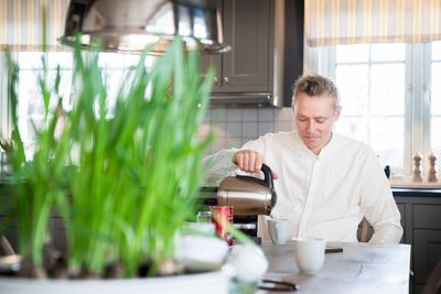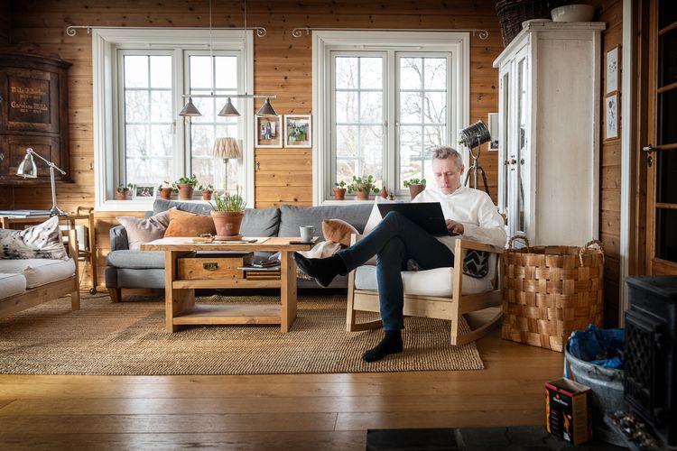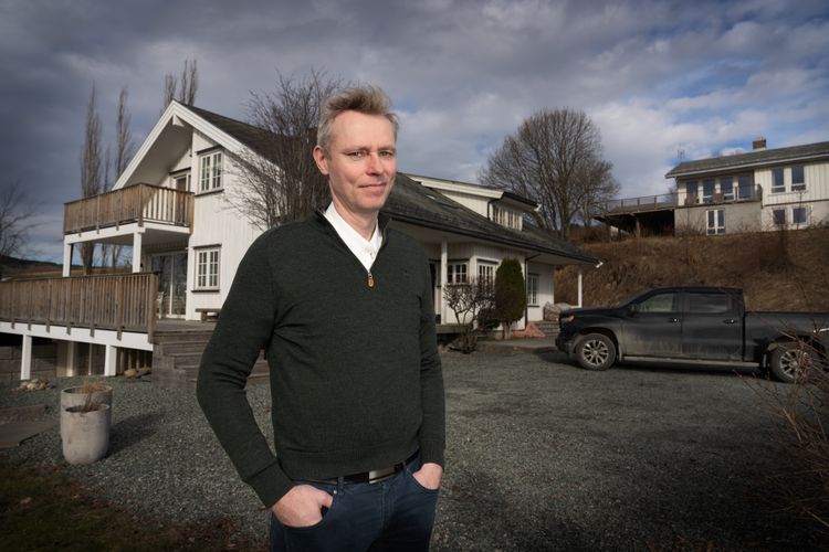 – Hei, Ola her, kom inn og få dere en kaffekopp. Jeg skal bare skrive ferdig en mail først, sier Ola Borten Moe der han står med en PC i hånda for å ønske oss velkommen inn i huset i Skjefstadbakkan.