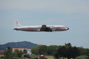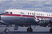 Det gamle DC-6-flyet har fått Braathens-farger og er på vei til Sola