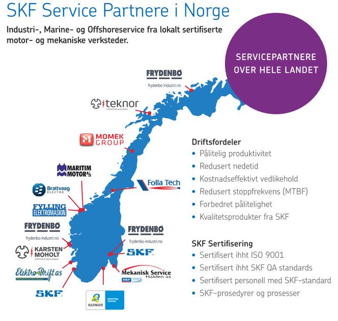 Derfor blir det mer og mer vanlig å leie inn sertifiserte lagerteknikere når det skal skrus på roterende maskineri. Det blir rett og slett for vanskelig å vedlikeholde den nødvendige kompetansen i bedriftene. For dette har SKF et omfattende nettverk av servicepartnere lokalisert i alle de store industriområdene i Norge.